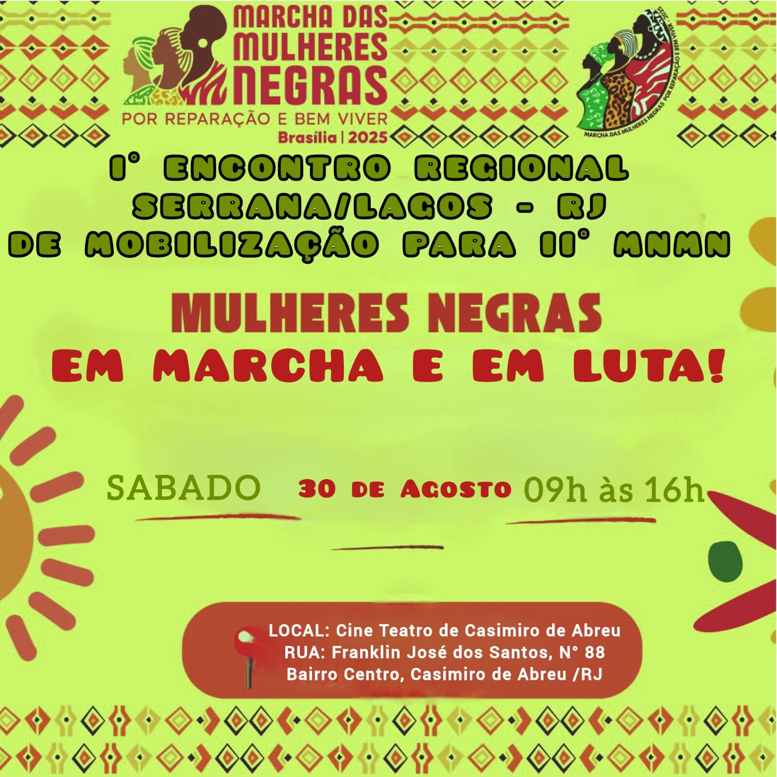 Sábado, 30 de agosto, tem o 1° Encontro Regional Serrana/Lagos -RJ de Mobilização para a 11° Marcha Nacional das Mulheres Negras- MNMN, no Cine Teatro Meus Oito Anos, 9h às 16h.