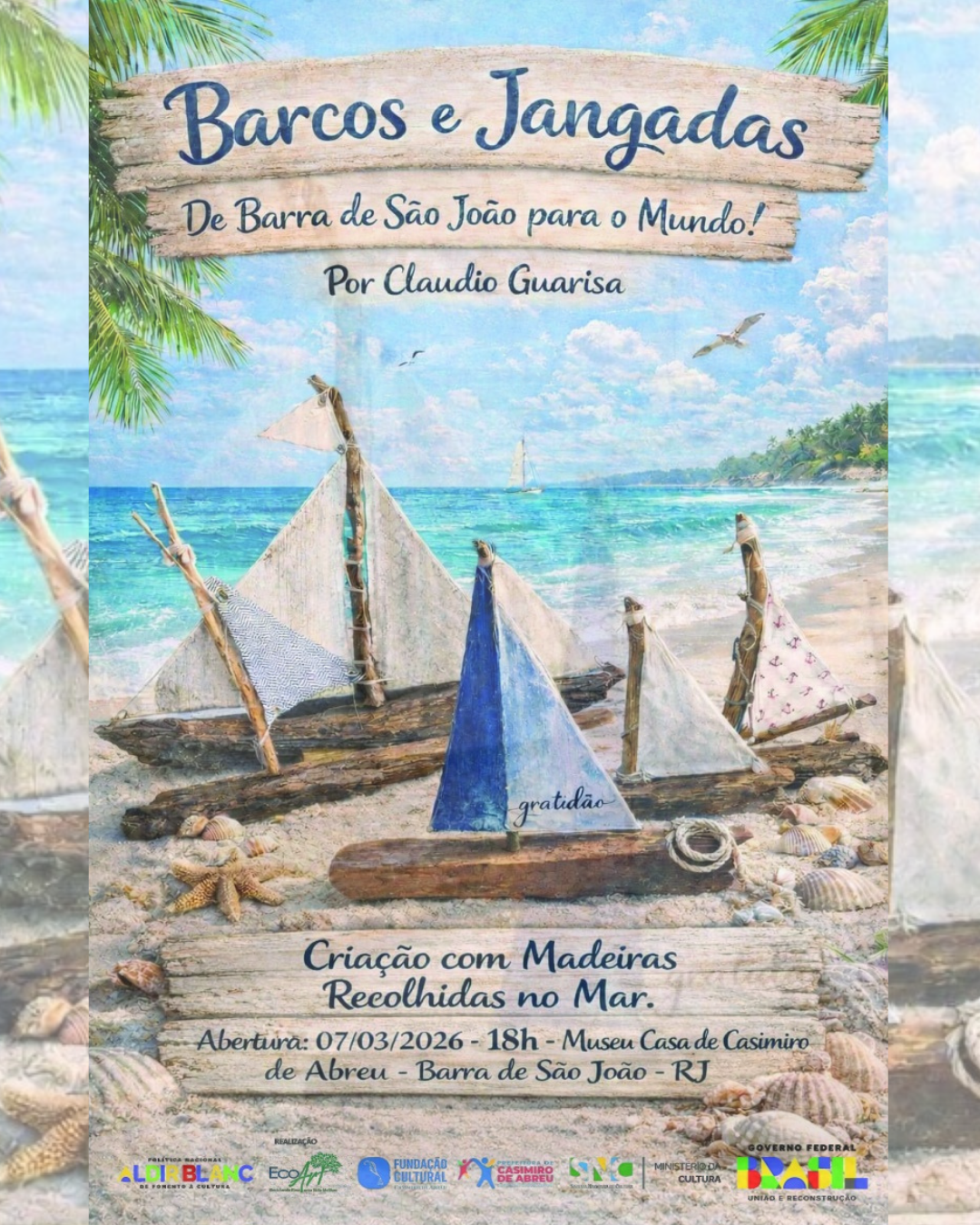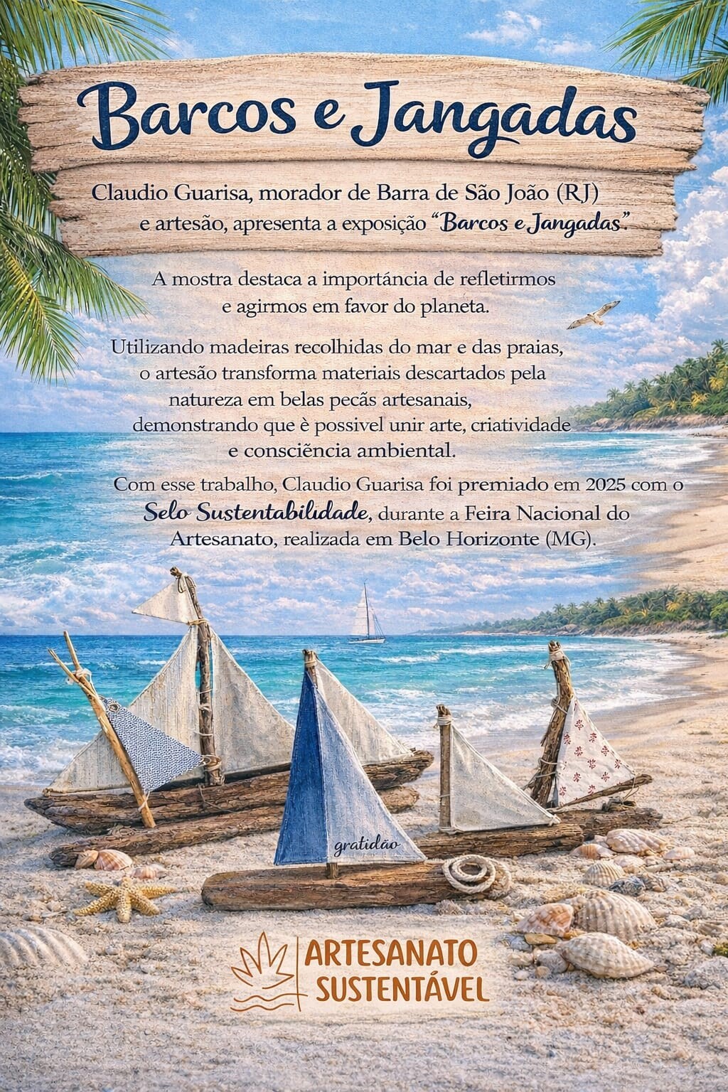 O artesão Claudio Guarisa apresenta a exposição “Barcos e Jangadas – De Barra de São João para o Mundo!”, uma mostra que transforma madeira recolhida do mar e das praias em delicadas peças artesanais cheias de significado, memória e poesia.